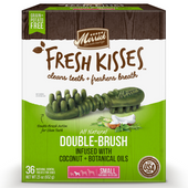 Description Sniff out the secret to fresh doggy breath with Merrick Fresh Kisses Coconut Oil and Botanicals Double-Brush Dental Dog Treats for small dogs. Sized specifically for small breed dogs weighing 15 to 25 pounds, these all natural dog chews deliver two big benefits: dog teeth cleaning and truly fresher breath. The double-brush design with coconut oil for dogs cleans your dog’s teeth like no other dental dog chew. These grain free dog treats are also potato free. With only 13 ingredients, these small dog chews will be a hit. Fresh Kisses dental chews for dogs are soft dog treats to effectively fight plaque and tartar from your dog's teeth as they chew, yet tough enough to last while they enjoy a happy chewing session. Merrick dog treats are cooked in the USA. Fresh Kisses chewy dog treats are easily digestible small dog treats, so make sure to feed daily...
