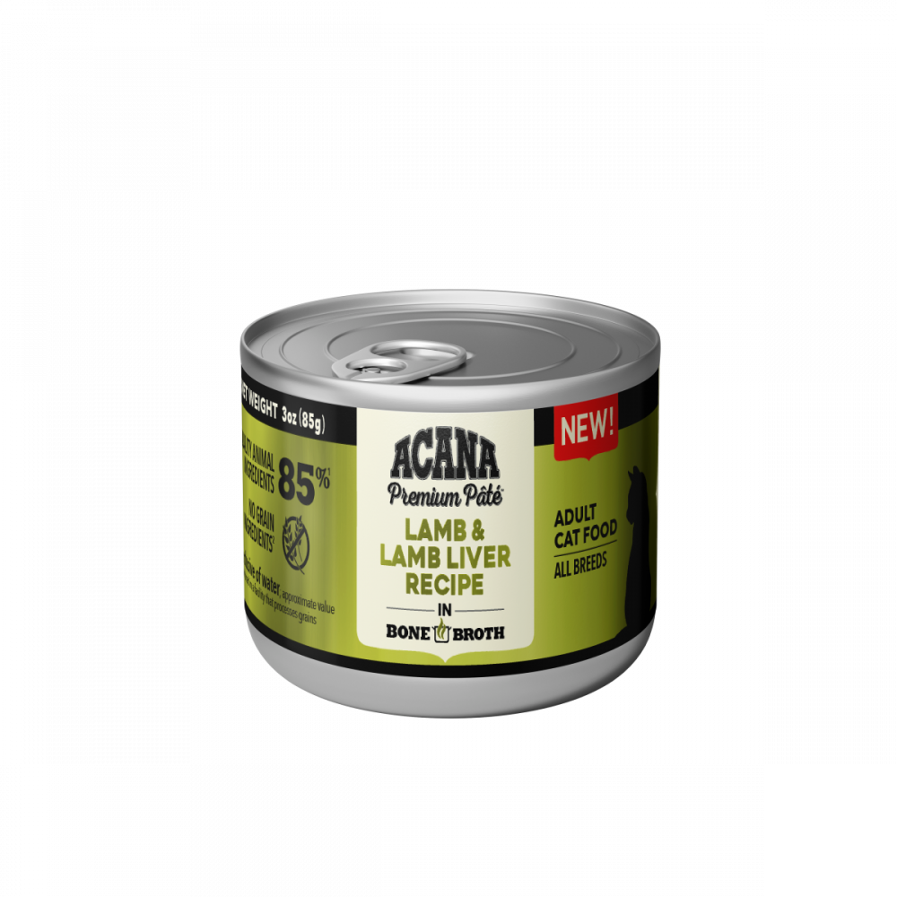 Bring home the quality nutrition your cat needs to thrive with ACANA PREMIUM PATE Lamb and Lamb Liver in Bone Broth Wet Cat Food. Rich with quality raw animal ingredients, ACANA PREMIUM PATE satisfies your cat completely with the animal protein they crave. This high protein cat food features nutrient-dense ingredients with the first six being raw* lamb, lamb liver, beef bone broth, chicken bone broth, lamb kidney and chicken, helping nourish your cat. ACANA cat food is 85 percent** quality animal ingredients and contains no grain ingredients***. This premium cat food pate also includes savory bone broth that provides the added hydration your cat needs, as well as a burst of delicious flavor in every bite. Choose ACANA wet cat food to give your companion the nutritional foundation they need to live a happy, healthy life.*Our included raw ingredients are frozen at the peak of freshness to preserve nutrients **Exclusive of water; Approximate and derived from the unprocessed state of the ingredients ***Produced in a facility that also processes grains<h3>Why We Love It</h3><br><ul><li>Twenty Four (24) 3 oz cans of ACANA PREMIUM PATE Lamb and Lamb Liver in Bone Broth Wet Cat Food<li>High protein cat food recipe includes 85 percent** animal ingredients and features raw* lamb, lamb liver, beef bone broth, chicken bone broth, lamb kidney and chicken<li>PREMIUM PATE contains no grain ingredients***</ul>From limited ingredient diets to recipes for all life stages, ACANA&REG; recipes for dogs and cats are thoughtfully crafted from start to finish to ensure that your pet has the high quality, balanced nutrition needed to live a long and happy life.