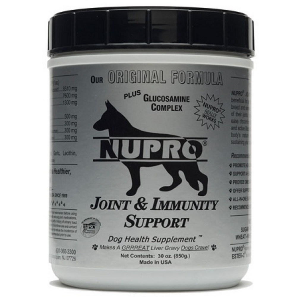 NUPRO Joint & Immunity Support Dog Health Supplement adds Glucosamine Complex, MSM, and Ester-C to enrich our Original 'Gold' Formula, especially for the Active and/or Senior animal. Your dog now has the benefit of a scientifically balanced combination of select ingredients specifically formulated to support normal joint structure, function and flexibility as well as promote optimal overall health and well-being. NUPRO Joint & Immunity Support helps to maintain the health and resiliency of joints, muscles and connective tissues, and to ease discomfort associated with normal daily exercise and active lifestyles.NUPRO Joint & Immunity Support is not just for Senior Dogs or those who may have joint issues! Active athletes (agility dogs, surfing dogs, dock-diving dogs, weight pulling dogs), show dogs, working dogs (police, arson, search and rescue K-9s), sled dogs, hunting dogs, herding dogs, AND large breed dogs, as well, will benefit from the addition of Glucosamine to their daily regimen. NUPRO Joint & Immunity Support's combination of raw, unprocessed ingredients with the added extras makes for a superior product from which ALL adult dogs will reap the rewards!